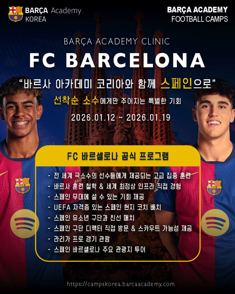 - 바르사만의 훈련 철학과 세계 최정상 인프라를 직접 경험하고 스페인 무대에 설 수 있는 기회를 제공합니다.